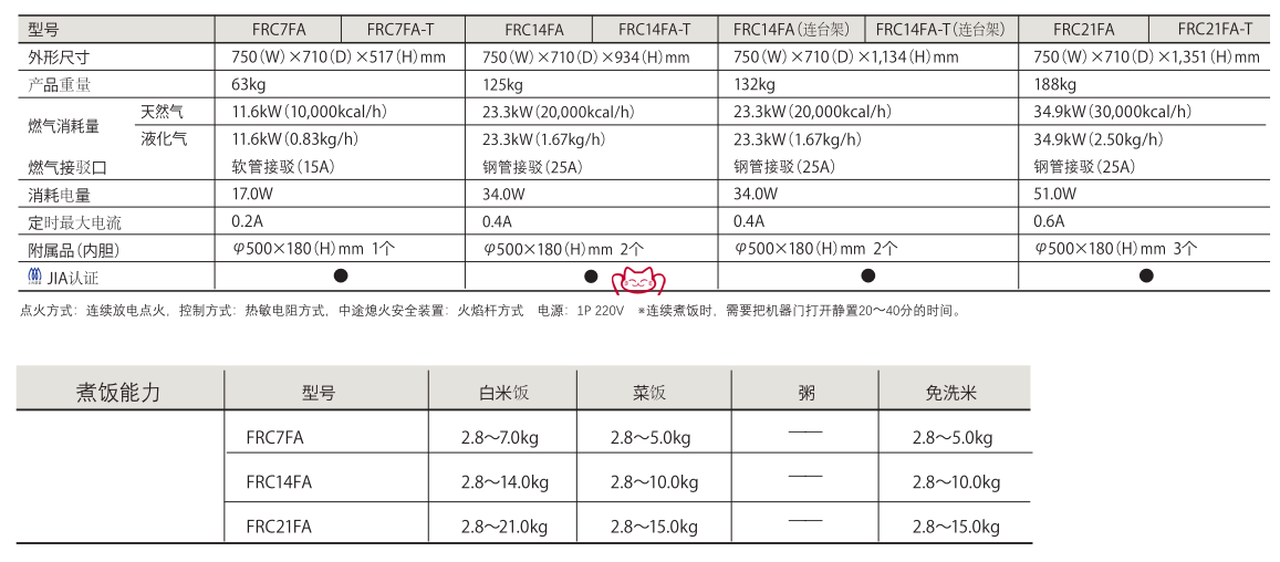 日本FUJIMAK FRC21FA燃?xì)庹麸埞?/span> 品牌:FUJIMAK 型號(hào):FRC21FA 規(guī)格:750X710X1351MM 功率:25500KCAL 容量:3X9LT 特征:燃?xì)庾詣?dòng)煮飯機(jī),使用煮飯機(jī)的強(qiáng)力爐頭和自開發(fā)的流程控制實(shí)現(xiàn)松軟口感和美味。 -為了實(shí)現(xiàn)美味搭載三種功能:所有流程都由電腦主板控制,呈現(xiàn)理想中的穩(wěn)定煮飯效果。采用「Steam Catch」系統(tǒng),利用蒸汽感應(yīng)探知蒸汽溫度,在適當(dāng)?shù)臅r(shí)間節(jié)點(diǎn)自動(dòng)切斷燃?xì)狻4钶d「微調(diào)功能」,可根據(jù)不同要求靈活調(diào)整煮飯效果。此外,燜飯功能,可去除煮飯后的多余水份使得米飯松而不粘。煮出美味的米飯,不再受燃?xì)夥N類,加熱溫度,內(nèi)膽材質(zhì)的限制. -采用煮飯機(jī)的大火力爐頭。淀粉的α化(即糊化度)決定了米飯的口感。為實(shí)現(xiàn)理想的α化、fujimak研發(fā)了的大火力強(qiáng)力爐頭,可實(shí)現(xiàn)加熱均勻。使每一粒米都能釋放原有的美味,實(shí)現(xiàn)理想的煮飯效果。 -簡(jiǎn)單操作的抽屜式。采用fujimak特有的抽屜式構(gòu)造。讓內(nèi)膽的拿取和放入工作變得更加輕松,安全。 -煮飯工藝 一目了然。 操作面板上搭載了更加直觀的顯示燈。從開始煮飯到結(jié)束的所有過程,都可以通過顯示燈進(jìn)行目視確認(rèn)。煮飯效果的微調(diào),及開始煮飯都是一鍵操作,簡(jiǎn)單方便